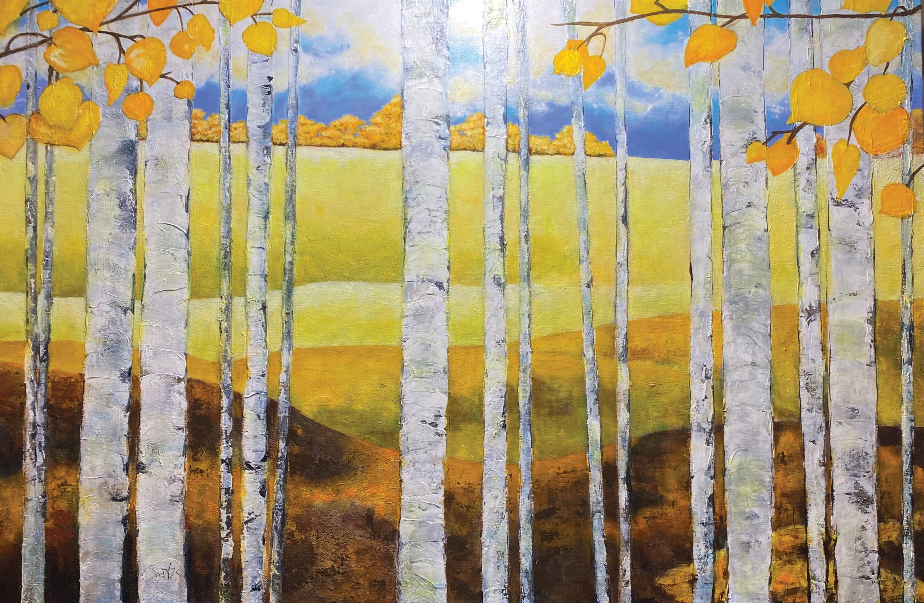 “I prefer wood panels because I like the texture, how rigid it is, how it sits off the wall and the beautiful, exposed wood sides. I explore and experiment with saturated color, hurried linework and abstraction. Ultimately, my art practice is about combining college, photography, and drawing with multiple layers of color to intuitively create work that has a sense of the places I am drawn to.”
