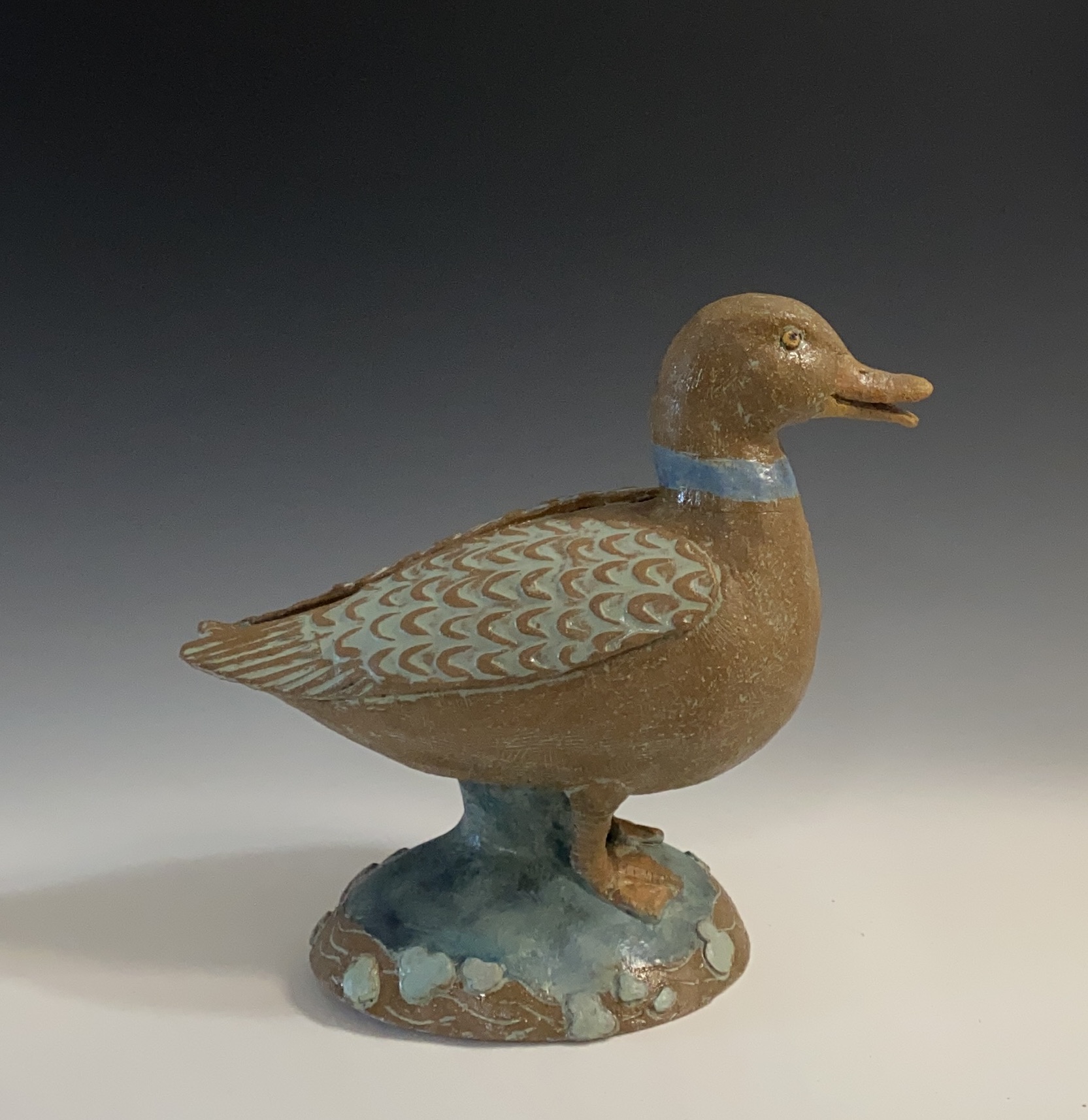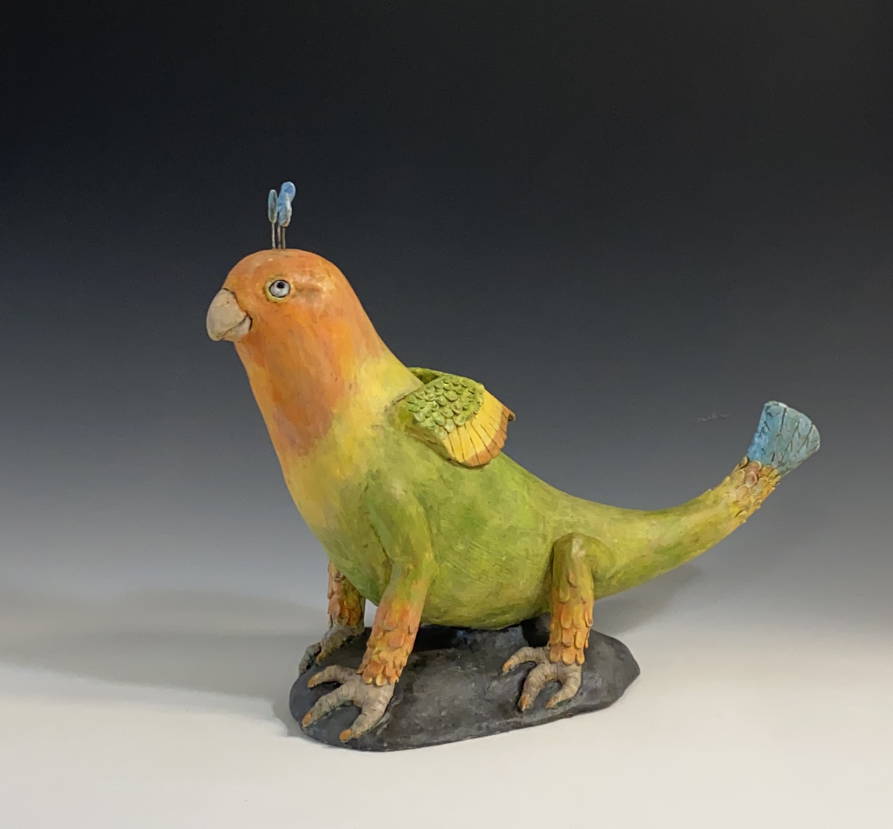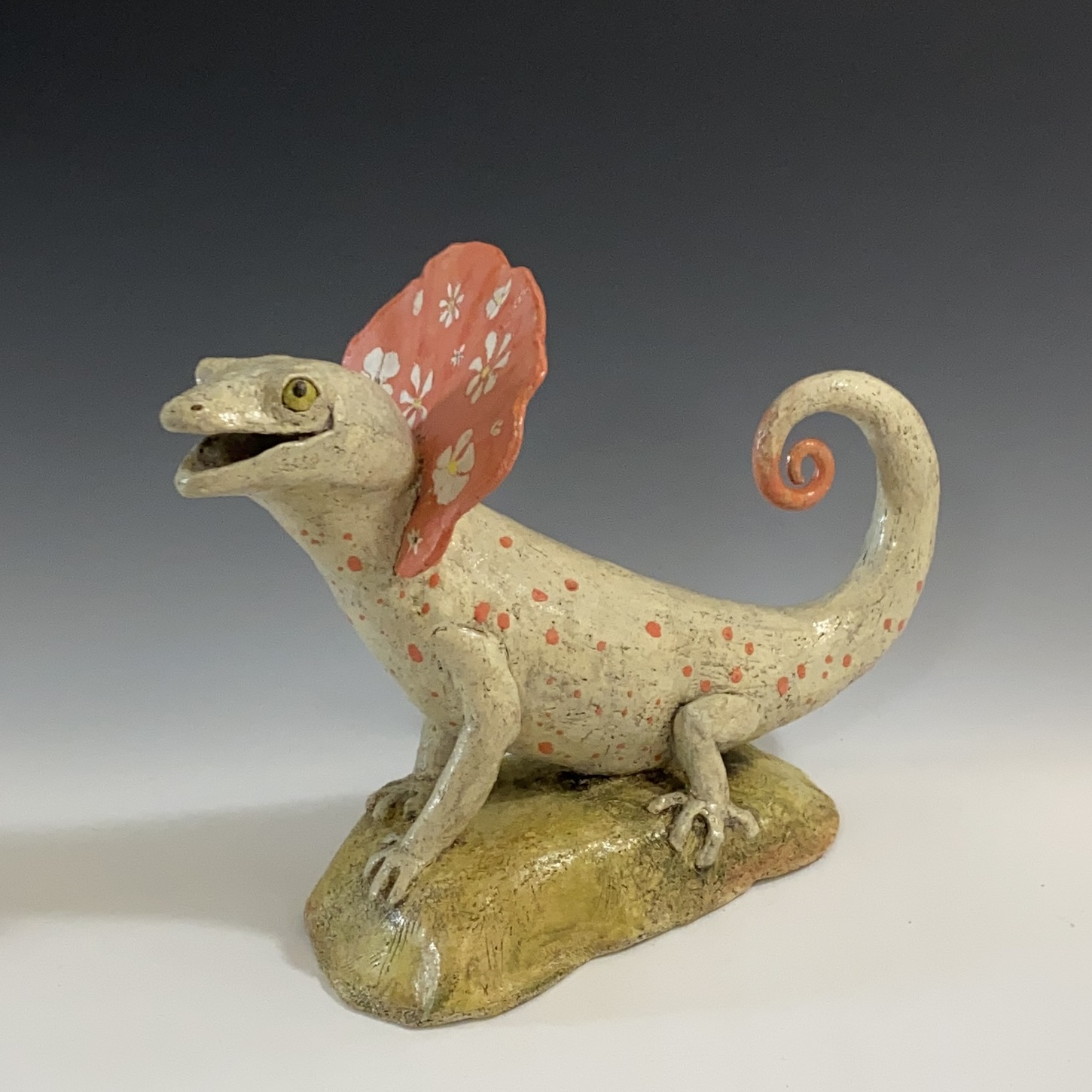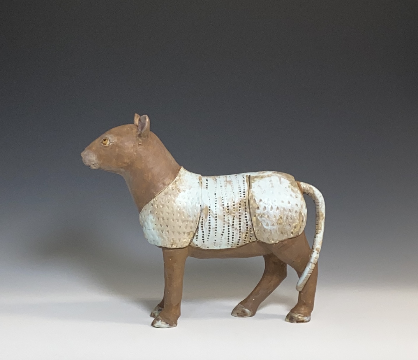 My work in ceramics has slowly evolved over the years first starting out with low relief wall hangings of plants and animals, then changing to 3-D animal heads and now free standing animal sculptures.