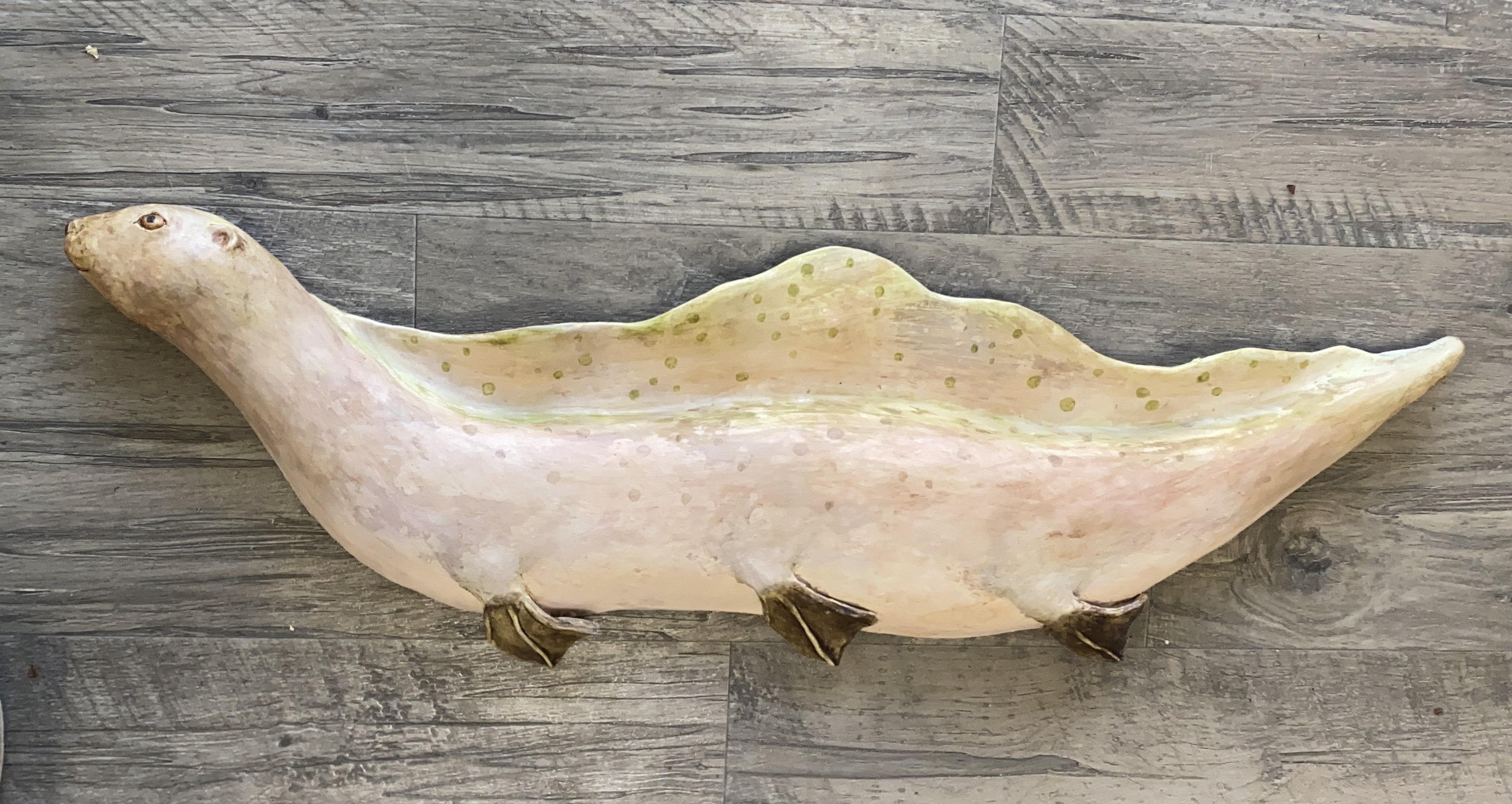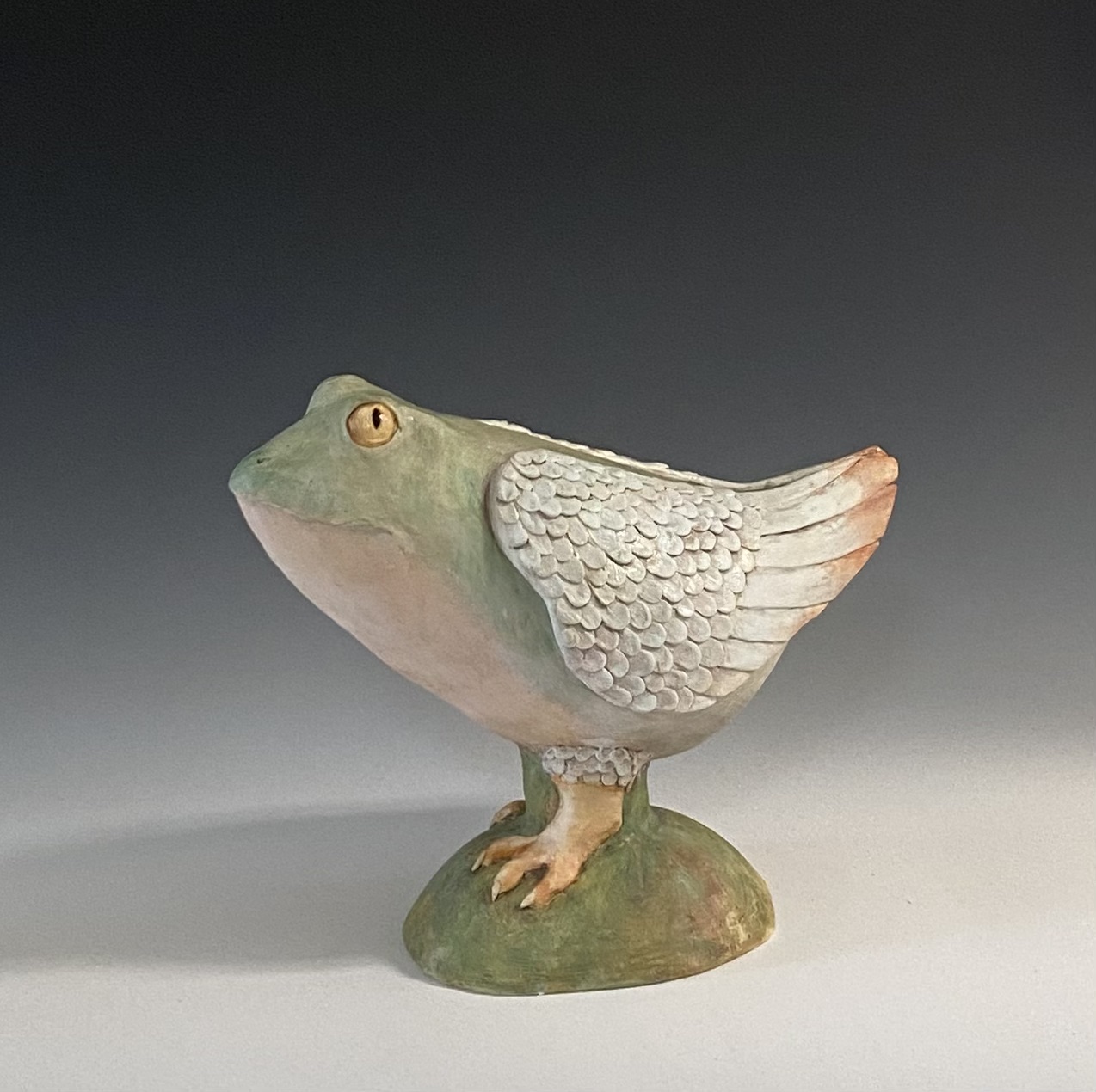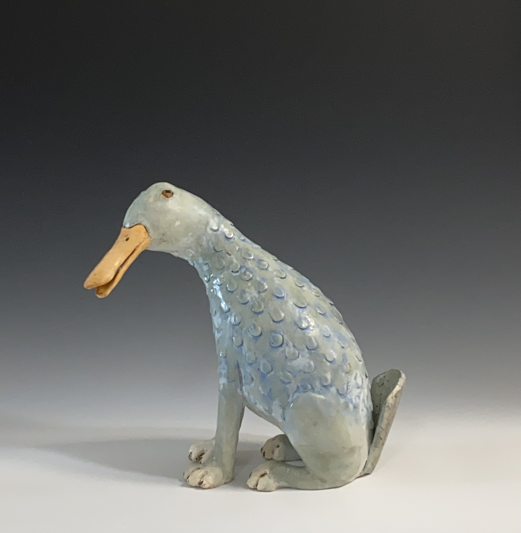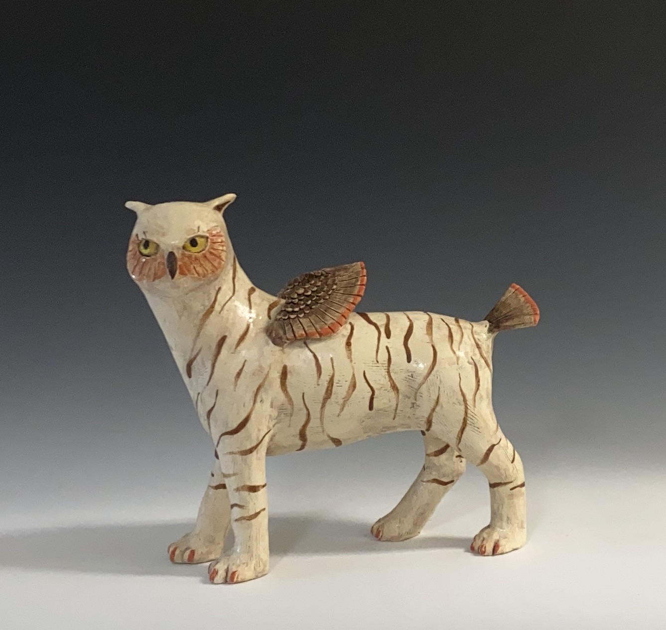 I sometimes enjoy discovering the symbolism of an animal and in this way find an added layer of meaning which always brings an element of surprise. This year (2023) I have started making “composite” animals or Chimeras. I have always felt inspired by the fantastical creatures depicted in the art of ancient cultures such as the Griffin, the Centaur and the Unicorn. I have so far made a “Duck/dog”, a Bird/fish and a Tiger/owl.
