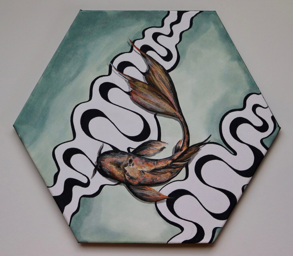 I love exploring contrast in my artwork. Whether it is the contrast between abstract and realistic compositions or organic and geometric shapes. I used to find myself separating the steady hum of a sewing machine and the soft quiet strokes of a paint brush, making some art that was abstract, and some that was realistic. Slowly, I realized that any of these contrasting ideas could exist harmoniously within one piece of art, which has led to my current body of work.