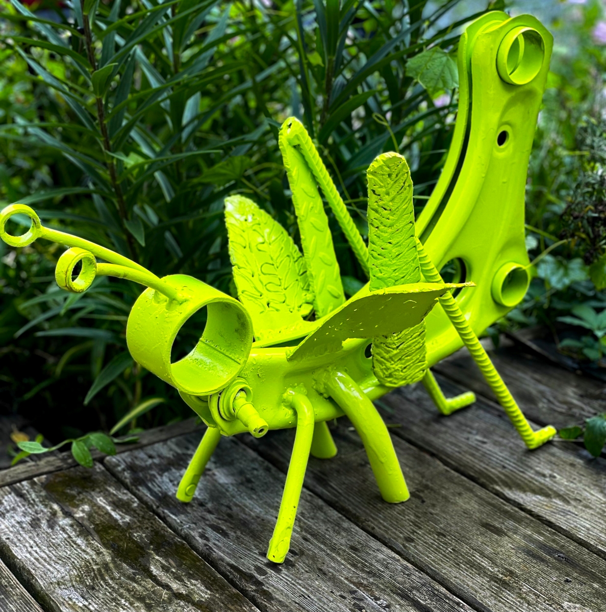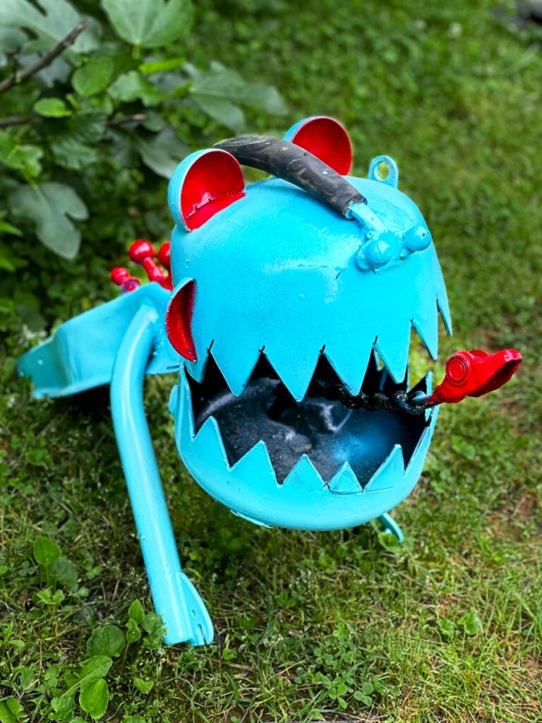 From then on, I bought a plasma cutter and began welding scrap metal into outdoor sculptures of flowers, bugs, and animals. I use metal from oil drums, broken bikes, gears, discarded engine parts – whatever I can find, and other people don’t want. The images came from what I love in the natural world – birds, insects, and plants—and what I can imagine –dragons and robots. I have recently started experimenting with abstract sculptures – thinking about form and balance. I am completely self-taught and push myself to try new things and create new pieces.