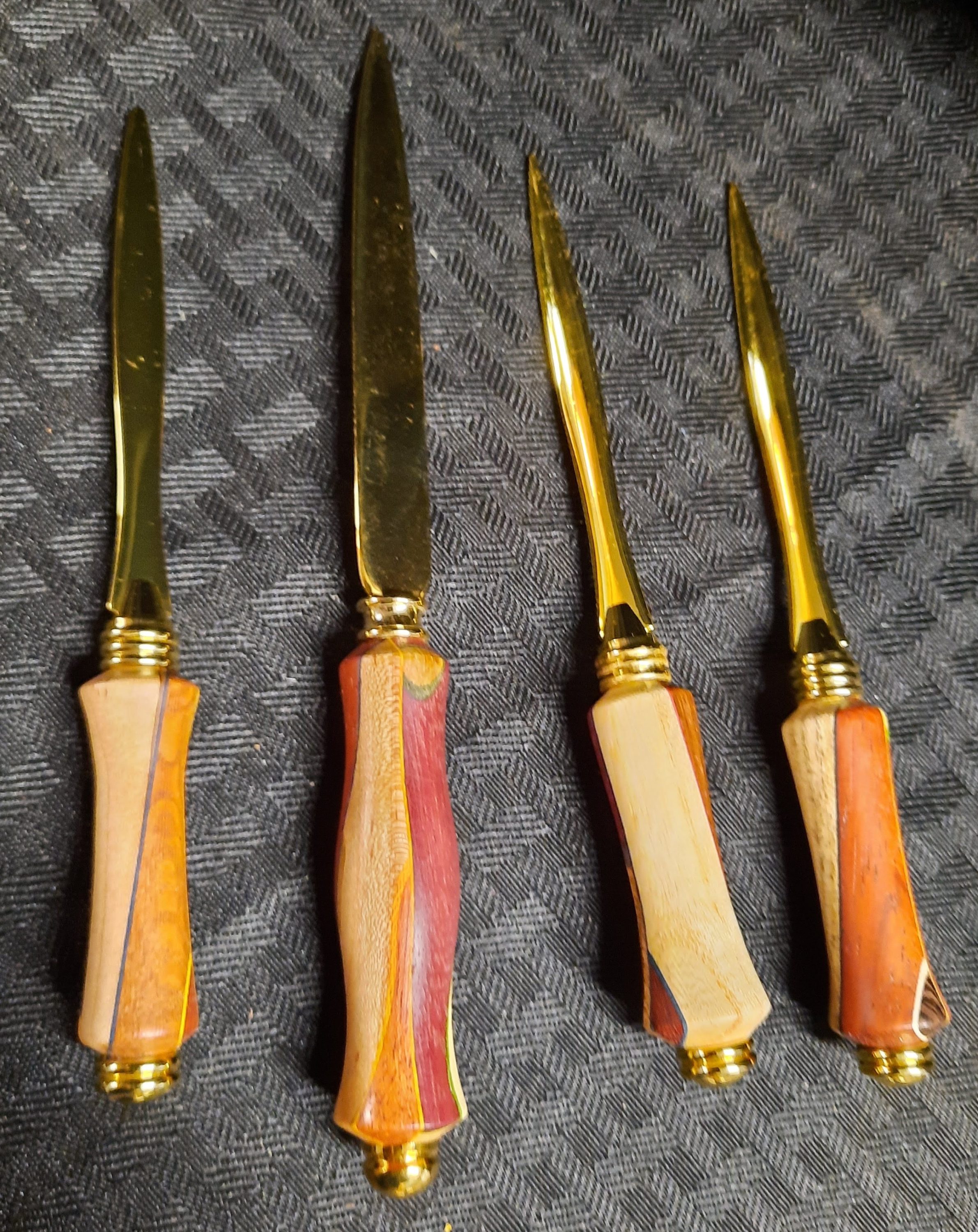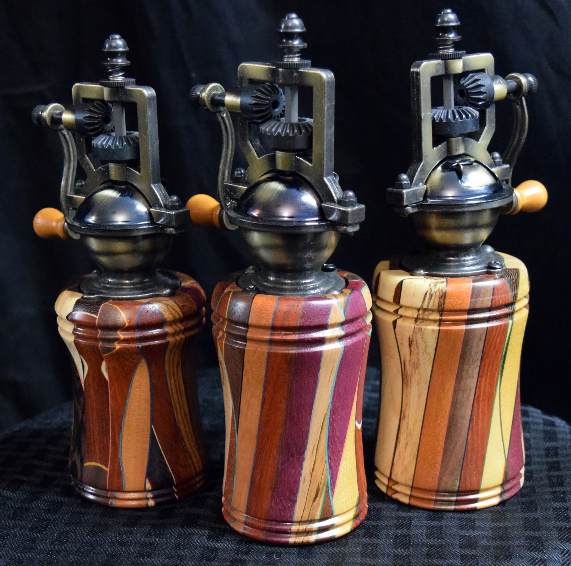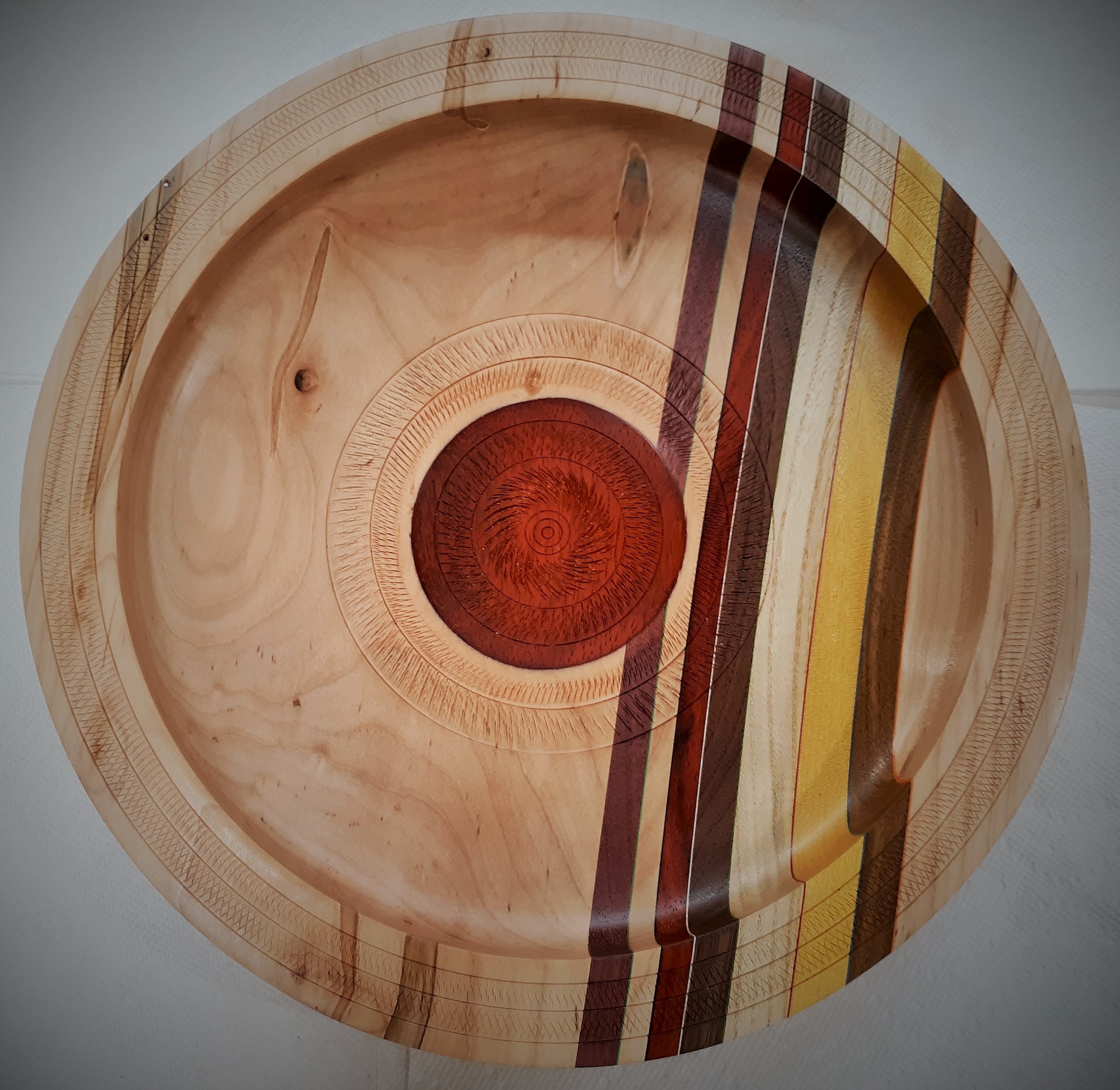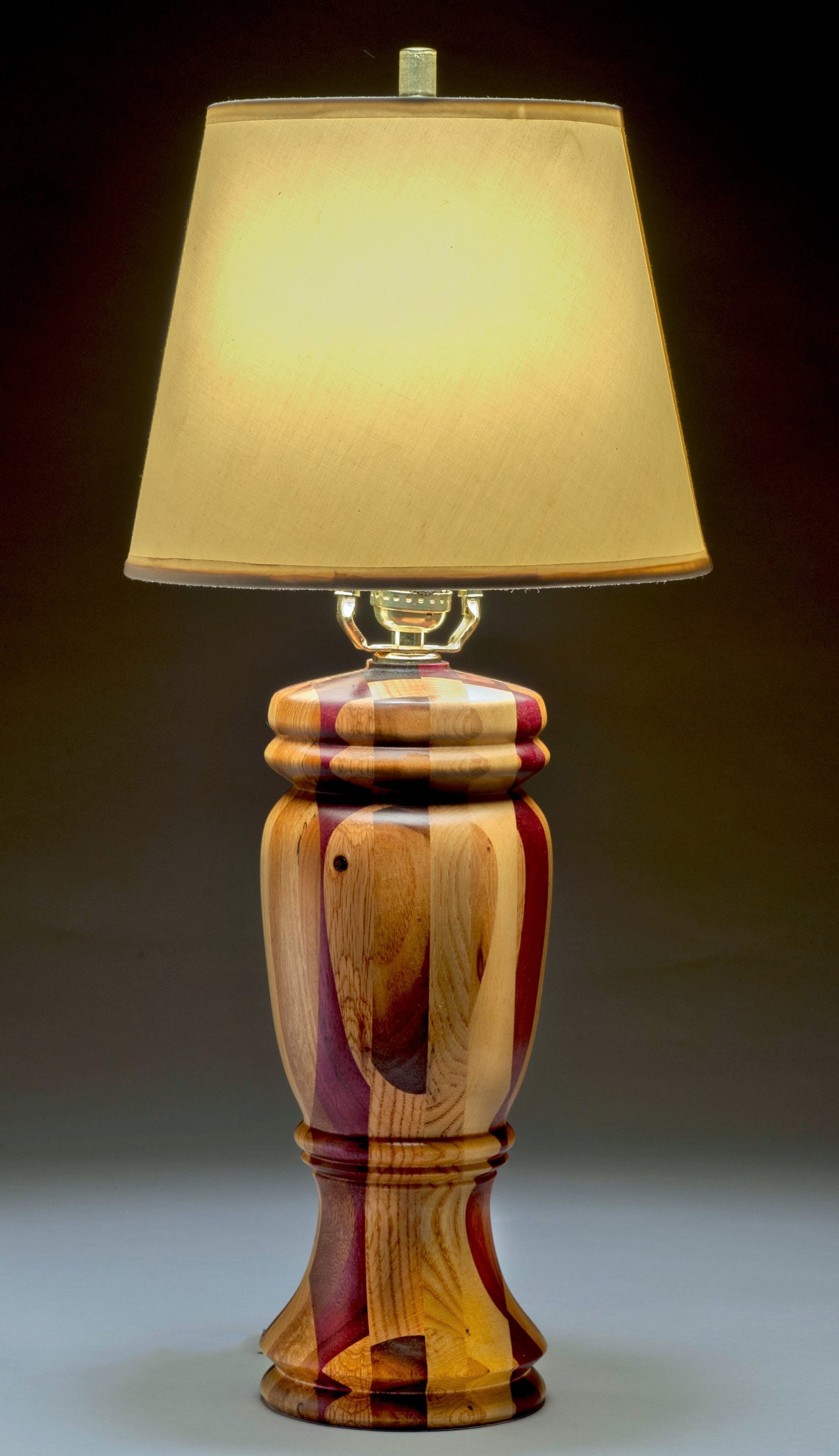 My primary goal is to use foreign and domestic hardwoods in accent colors to create beautiful and useful items. I particularly like to use woods that provide a contrast to each other. These include exotic (foreign) varieties such as: padauk, bocote, bubinga, mahogany, morado, tigerwood, purpleheart, rosewood, chakte viga, ebony, sapelle, wenge and many others, and the domestic hardwoods such as black walnut. oak, sweet hackberry, poplar, osage orange, elm, black and wild cherry, ash, ambrosia maple, holly and sycamore. I especially like to include woods that contain spalting, fine figuring or unusual grain characteristics. A crotch wood piece because of its fantastic figuring is also very important to turn for bowls and platters. I also experiment with a large array of finishes to bring out the best in the wood. I use stone such as turquoise, malachite and blue lapis to “fix” defects in the wood caused by knots or wormholes. Finished items include lamp bases, cutting boards, cheese platters, pens, salt and pepper shakers, pepper grinders, wine bottle stoppers, Christmas ornaments, bowls and platters, ice cream scoops, pizza cutters and many other useful items.