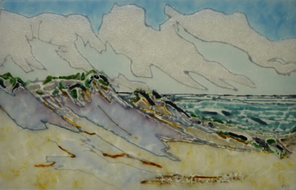 My interest in sculptural glass has expanded my exploration from painting onto glass with enamels, fusing and slumping glass, to pate de verre, casting glass paste into molds of my own creation that fire in the kiln.