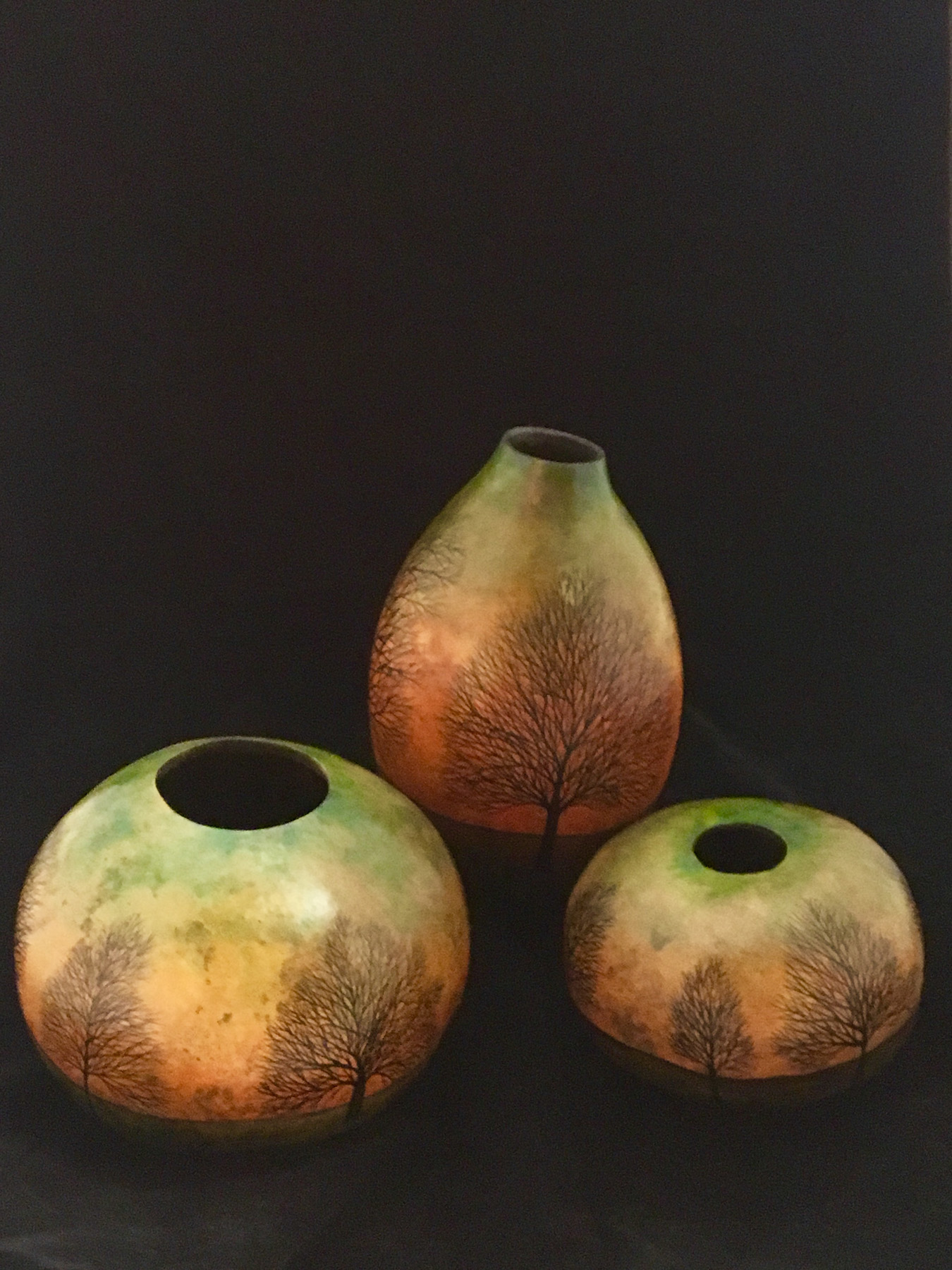 Gourds have naturally beautiful shapes and colors that I embellish using watercolors, ink and found objects. Most of my pieces are painted with images from nature – trees, nests, birds, lizards, etc. The finished sculptures are sealed with wax to become permanent 3-D paintings.