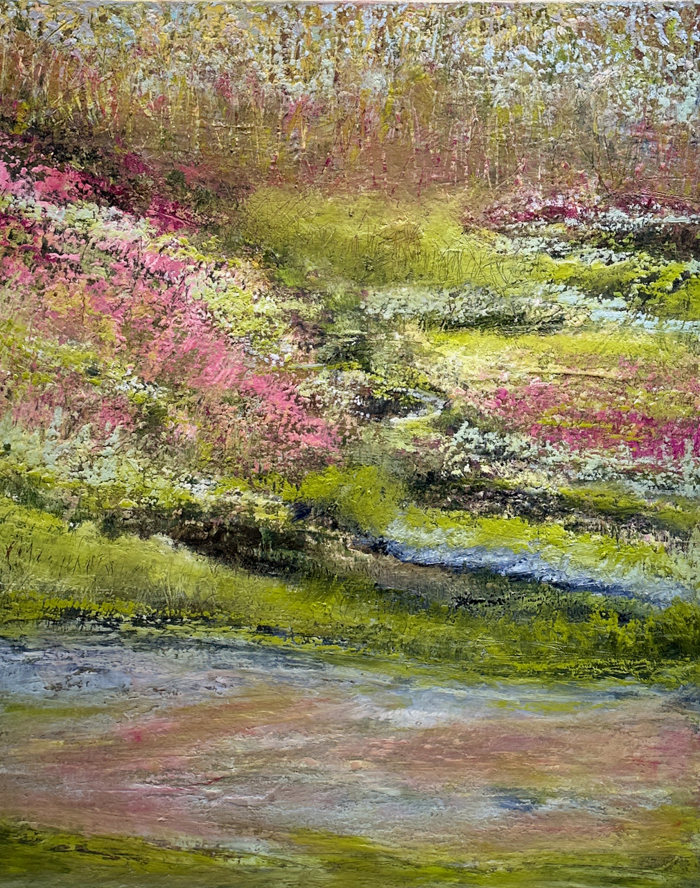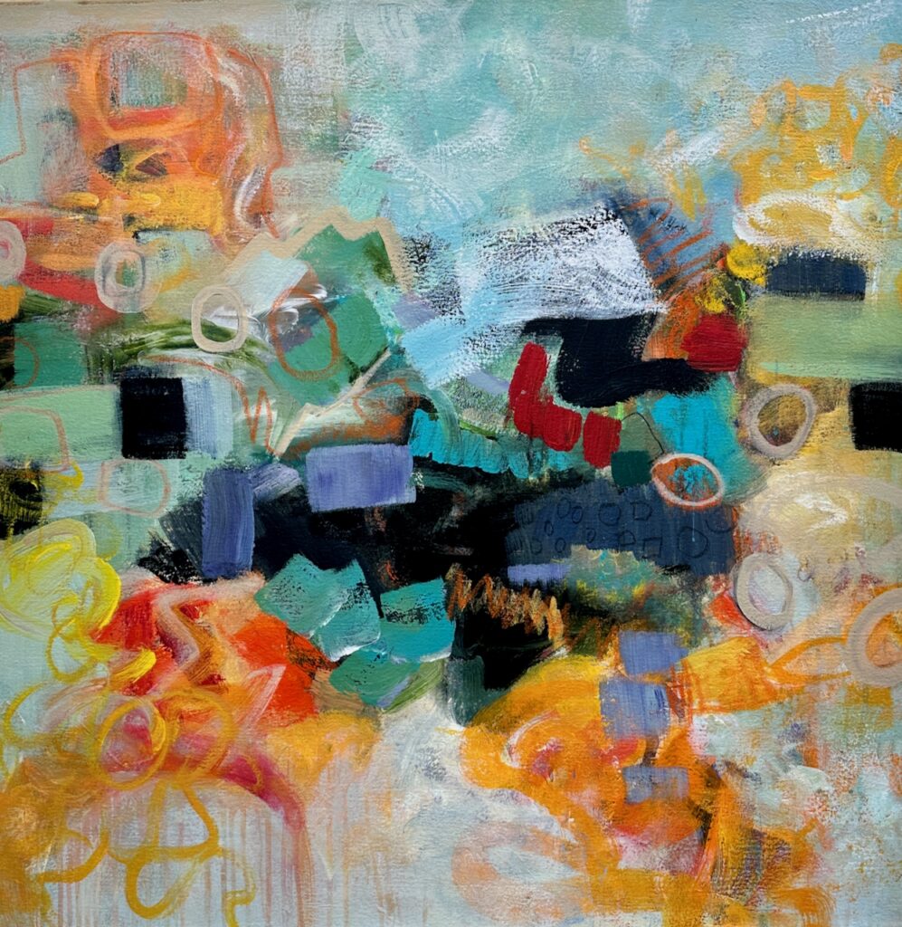 I paint intuitively, starting with an idea of colors I want to use and a feeling. Then a memory seems to emerge and become part of the process of building layers of color and texture. This memory is based in places I’ve been, music I’ve heard or experiences I’ve had, especially in nature. Finding colors, textures, shapes and lines that create a harmonious world leads me as I work. Sometimes my work is abstract and sometimes landscape based.