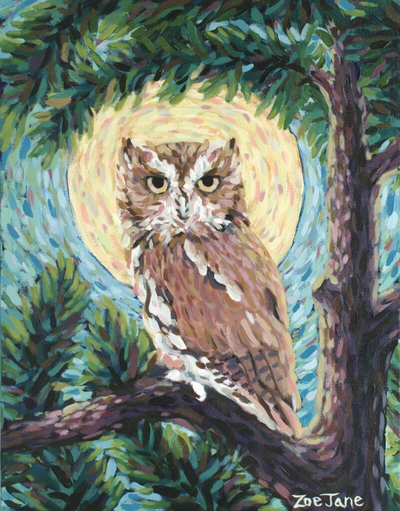 I create art to connect people to nature. In many cultures, it’s not uncommon to find that humans are seen as the rightful rulers over all other creatures. I feel that this uncomfortably separates humanity from the rest of nature. The complexity and beauty of other life becomes oversimplified and can often pale in comparison to the attention we give to human matters. However, humans are on the tree of life with everything else. We are made up of the same matter as everything else. There is a concept found in Pantheism and Hinduism which I feel resolves this separation. It asserts that every being contains a spark of the divine. Through my art, I try to connect the viewer to this concept. When I paint animals in particular, I like to give them a wise, almost regal, appearance. Sometimes, I symbolize this by adding a halo, a sun, or moon around their head. In this way, I hope to give other creatures the platform and the divine spark that humans give to themselves by default.